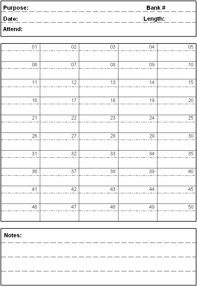 The Frequency Chart can also be used as a log for single sessions using the Date, Attendees, and Notes sections. These would typically be left blank if the only purpose of the chart was to provide a reference copy of the frequencies in a bank.