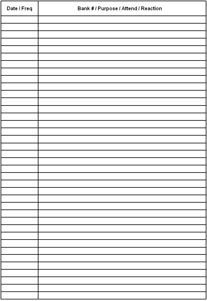 At the start of a session, the date is entered on the left and the bank number, attendees, and purpose of the session is noted on the right (use as many lines as needed). If there are hits during the session, the frequencies are entered on the left and the attendee and their reaction is noted on the right.