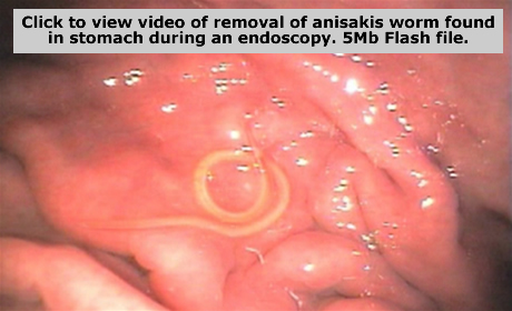 Comments on video of removal of anisakis simplex seen during endoscopy: This 61 year old restaurant owner was referred for upper endoscopy to evaluate typical longstanding dyspepsia and reflux type symptoms. His upper endoscopy appeared quite normal except for what initially appeared to be a wisp of mucin floating in the gastric fundus. On closer inspection, this worm like structure was seen and identified as the marine parasite anisakis simplex which is the cause of anisakiasis.