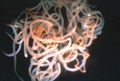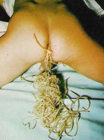 Massive ascaris infection in child shown at right. A large bolus of worms was expelled following antihelminthic treatment. This is one of the best-known photographs showing severe roundworm infection.