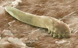 Demodex folliculorum, or the demodicid also known as the eyelash mite, is a tiny mite, less than 0.4 mm long, that lives in pores and hair follicles, usually on the nose, forehead, cheek, and chin, and often in the roots of eyelashes. (A follicle is the pore from which a hair grows). It is not really a parasite since it lives on dead skin cells and secretions, but overgrowth of them can cause irritation.