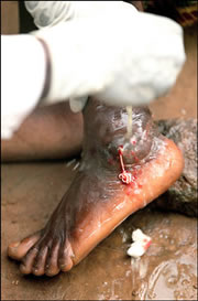 Guinea Worms. First swallowed by a "Cyclops" or water flea, the Guinea worm transforms into a third stage larvae. The Cyclops, ingested by a human being, are consumed by the stomach's juices and the larvae of the Guinea Worm are released. They remain in the stomach for up to three months. After mating, the male dies and the female bores through the body making her way to the extremities, usually the lower leg or foot, but she can go to any part of the body. Once settled, just under the skin, she begins to grow, by eating the flesh of her carrier, into a three to As the worm matures, a painful blister appears on the skin of the carrier. When the person puts the affected part of the body in water, the blister breaks and hundreds of thousands of tiny first stage larvae are released into the water. The adult female worm then comes slowly out of the body of its carrier through the sore made by the broken blister. It usually takes several weeks for the worm to completely exit the body. People, having no choice, drink the infested water, ingest the worm and the entire cycle begins once again. No matter how often people are infected they do not become immune to the Guinea Worm. Both young and old alike are subject to this dreaded parasite. |