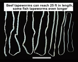 There are numerous species of tapeworm, which may be as long as 50 ft. (15 m). Their bodies are made up of segments called proglottids, which contain male and female sexual organs and which house their eggs. The Taenia genus of tapeworm includes T. solium, the pork tapeworm, which has been known to crawl out of the anus of an infected human. Another worm often found in under-cooked pork is Trichinella spiralis, which brings about the condition known as trichinosis. The latter disease is rarely fatal, but it can cause extreme discomfort, characterized by sore, tender muscles. Thanks to enhanced efforts at meat inspection, the incidence of trichinosis in U.S. pigs has dropped to less than 1%. Nonetheless, it is still quite possible to ingest the parasite from eating undercooked game, particularly bear. |