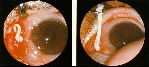 Removal of Sparganosis mansoni, a tapeworm larva, from eye. Adult tapeworms can reach lengths of 100cm or 40 inches. After penetrating the mucosa lining of the small intestine, they migrate systemically throughout the body, invading a variety of tissues and organs, and can live for years.