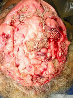 However, the actual story is that it was a man in his 70s who was suffering from an unusual form of cancer which had eaten away at the upper portion of his skull and scalp but had not caused him any pain so he had not sought medical help. He was involved in a minor auto accident and the paramedics found him in this condition. There was no explanation as to whether a minor accident had caused the damage and dislodged fragile tissue or if the scalp had already been eaten away. There were indeed many insects and maggots infesting his brain. |