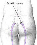 The sciatic nerve exits the spinal column between the lowest lumbar vertebral body (L5) and first level of the sacrum (S1). It supplies sensation to the posterior thigh and buttock, knee flexors, and foot muscles. When this nerve is compressed, inflamed, or irritated anywhere along its length, pain may result. The term sciatica refers to a pain that radiates from the lower back into the buttocks and down the back of one or both legs. The sciatic nerve is the largest nerve of the body.