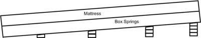3b. Use stacked 2x4's, attached to each other and also to the box spring frame, which run the width of the box spring. Although it is probably sufficient to just use two stacks, one at the top and one at the middle, it is better to have three or four stacks to better distribute the weight. Some box spring frames may not be strong enough for a heavy person to plop down halfway between a frame supported with two stacks and the frame could crack, or warp over time even with a light person. Using stacks of 4, 3, 2, and 1 will reduce the chance of this occurring. Again, it is best if the portions of lumber that contact the box spring frame are shaved, sawed, mitered, or sanded to the same angle as the bed as shown in the diagram below.