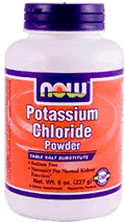 Potassium chloride is a sodium salt substitute that is helpful to balance excess sodium in the diet. Now Foods makes potassium chloride powder. This can be mixed in a 1:1 ratio with a sodium salt to provide a potassium-rich mineral source used to salt food instead of pure sodium chloride. The Now product is quite reasonable and much preferred over common commercial potassium chloride products like No Salt since it is not polluted with mineral oil or other petrochemical products, or aluminum. Keep in mind that most potassium in the diet should come from fruits and vegetables instead of in chloride form.